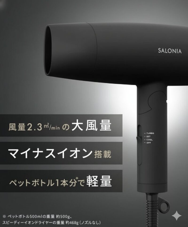 今回は、「速乾性」と「コスパ」で圧倒的な人気を誇るSALONIA(サロニア)のスピーディー イオンドライヤー(型番:SL-013/通称:sal004)を徹底レビューします。